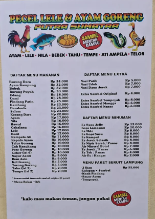 Restoran ini menjual berbagai menu varian kuliner seperti: Aneka Nasi, Seafood, Aneka Ayam Bebek. yang sangat enak dinikmati bersama keluarga anda. Terlebih buat kalian yang suka pedes wajib mampir ke @pecelleleputrasumatra disini menunya itu super lengkap,ada juga makanan khas Lampung namanya Seruit ada sambal tempoyak khas lampung !!! Sambel rampainya bikin pingin nambah terus ditambah menu minuman baru juga yang bikin seger dan menghangatkan badanmu.